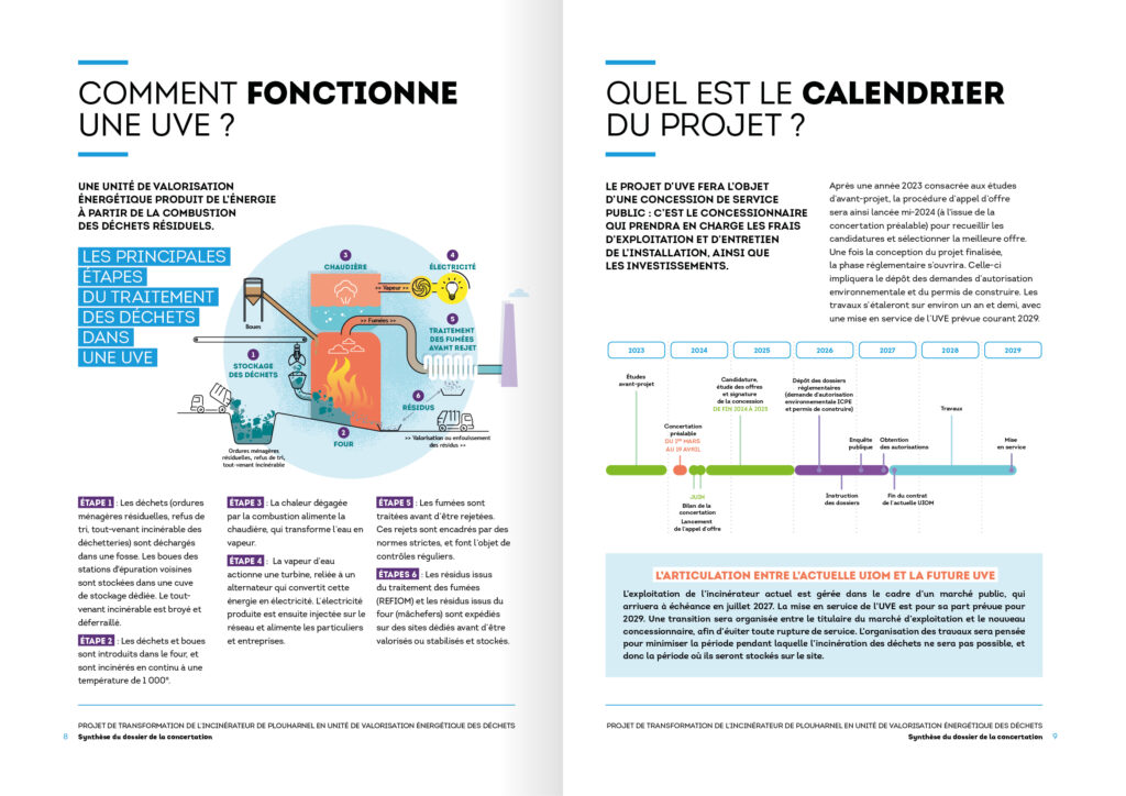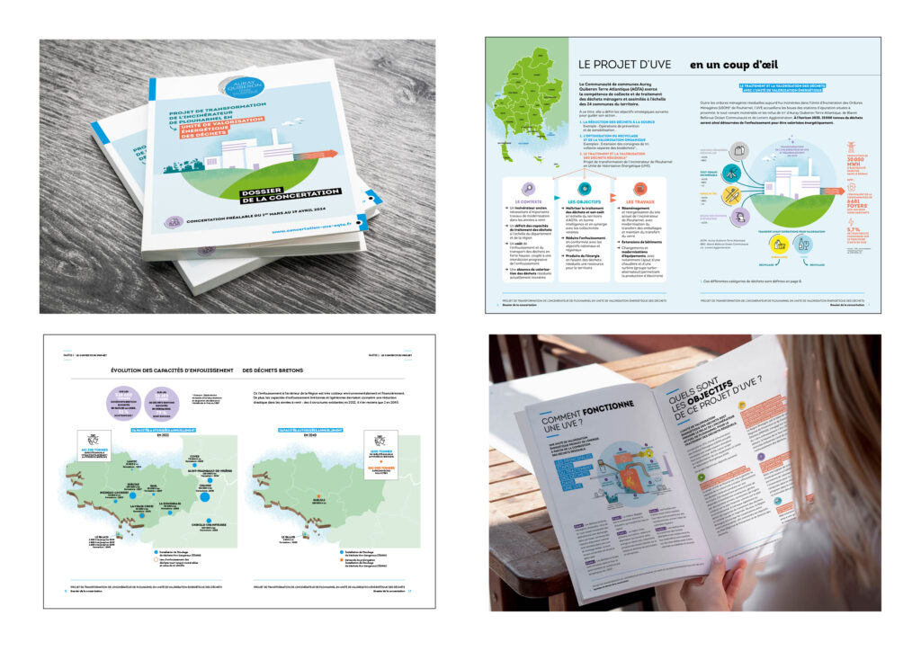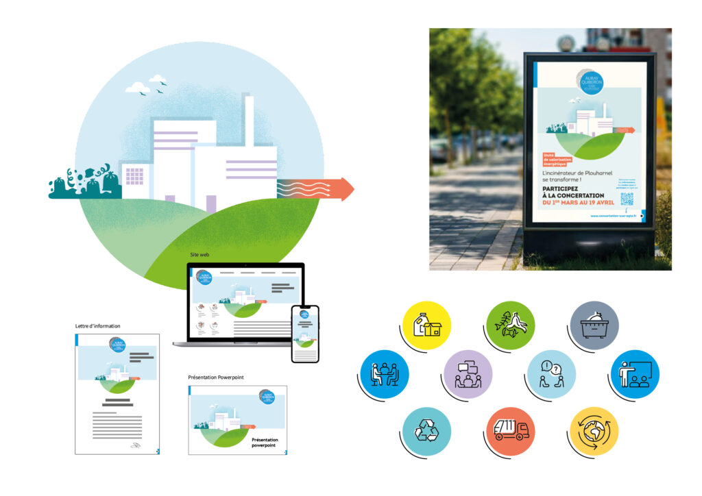 Appel d’offre remporté en association avec l’agence Tact pour communiquer autour du projet de transformation de l’incinérateur de Plouharnel en unité de valorisation énergétique des déchets. Création d’une charte graphique et d’un visuel emblématique pour tous les supports de communication.